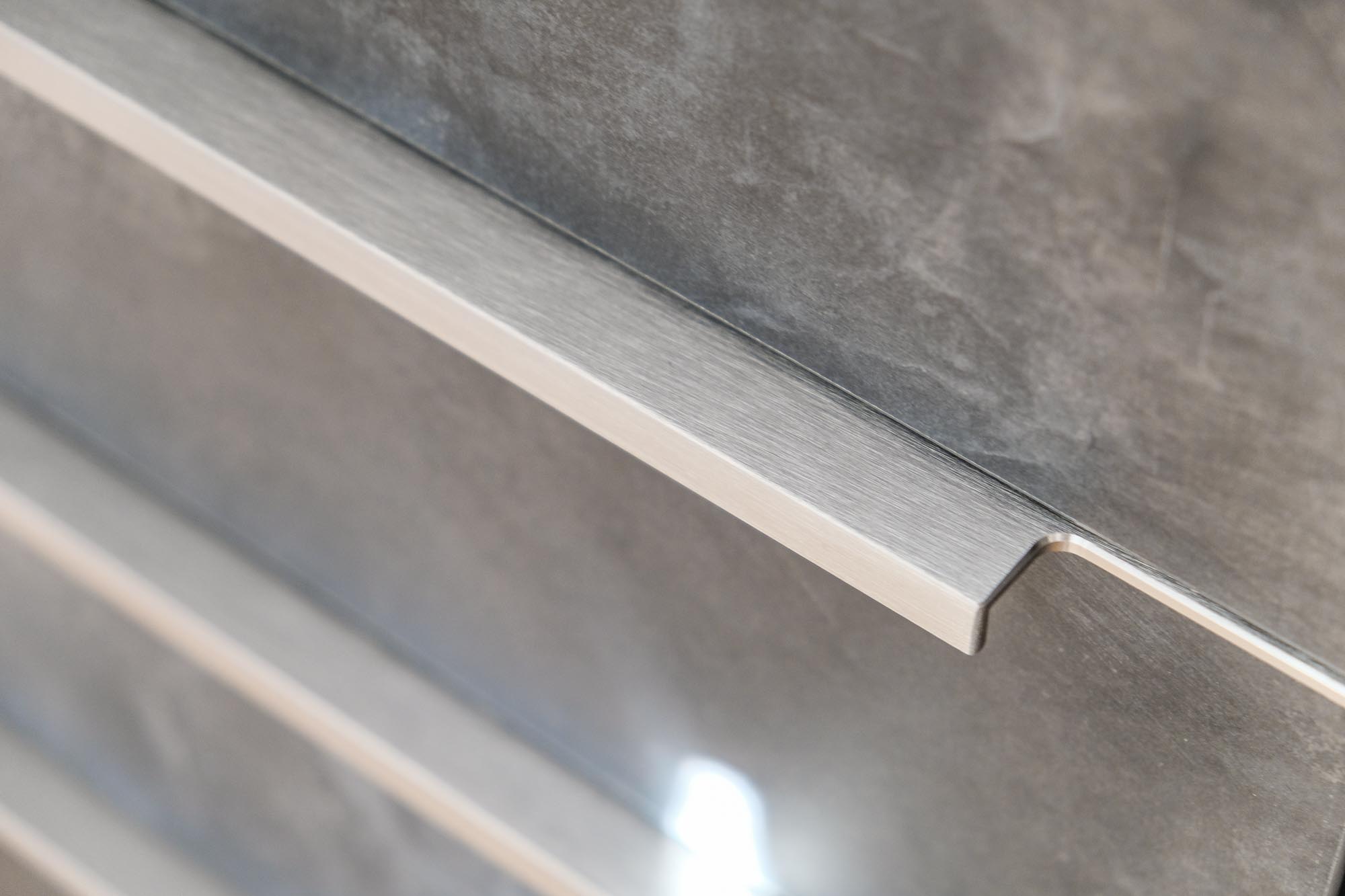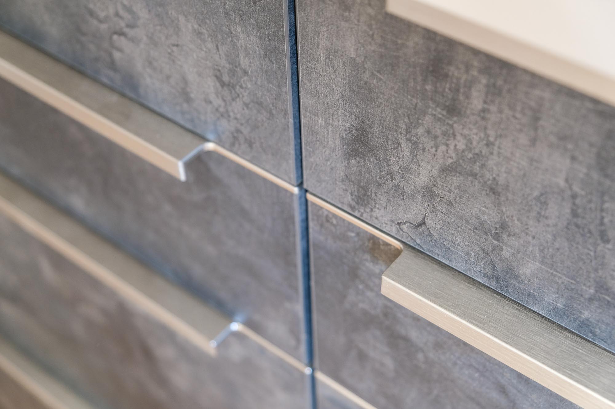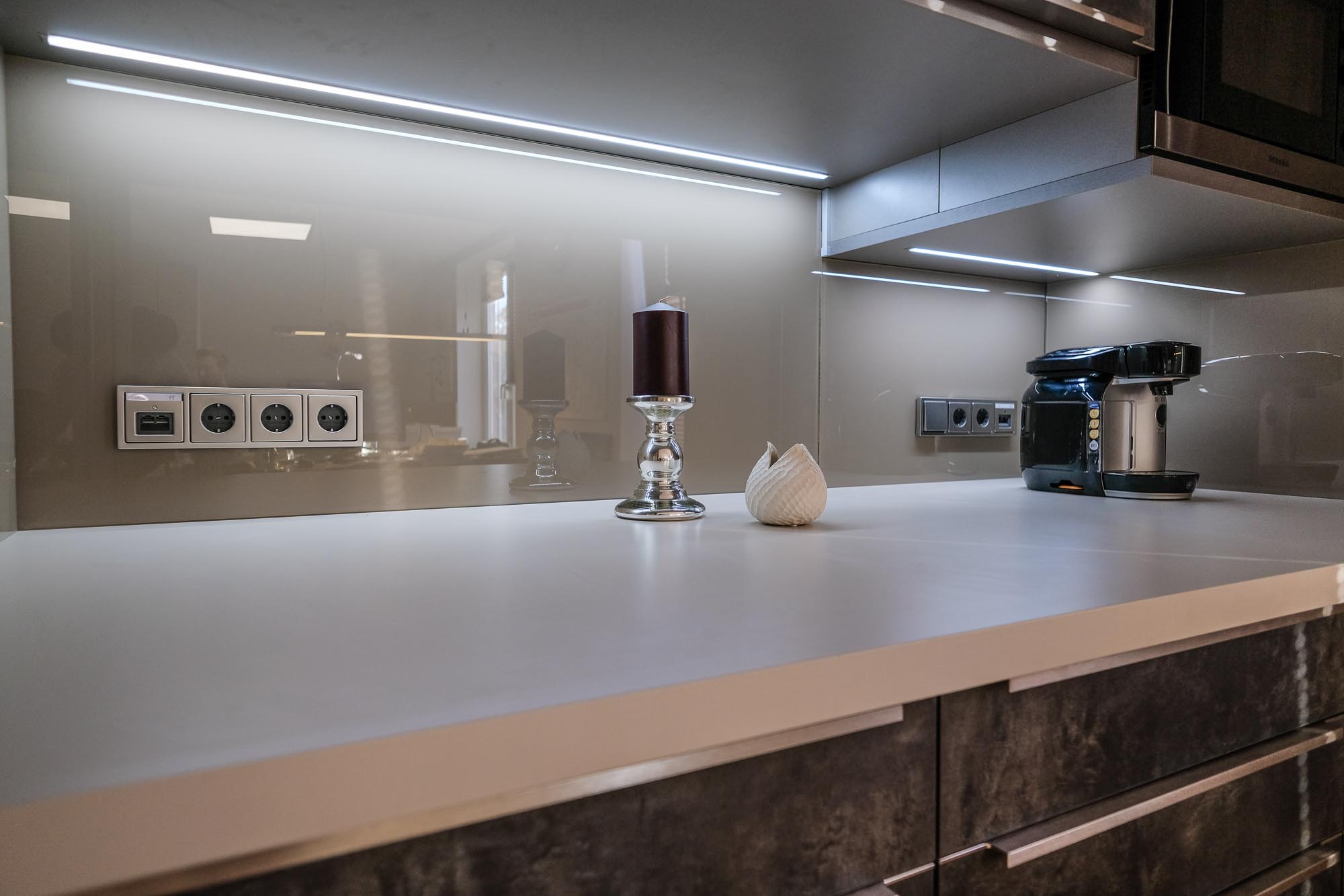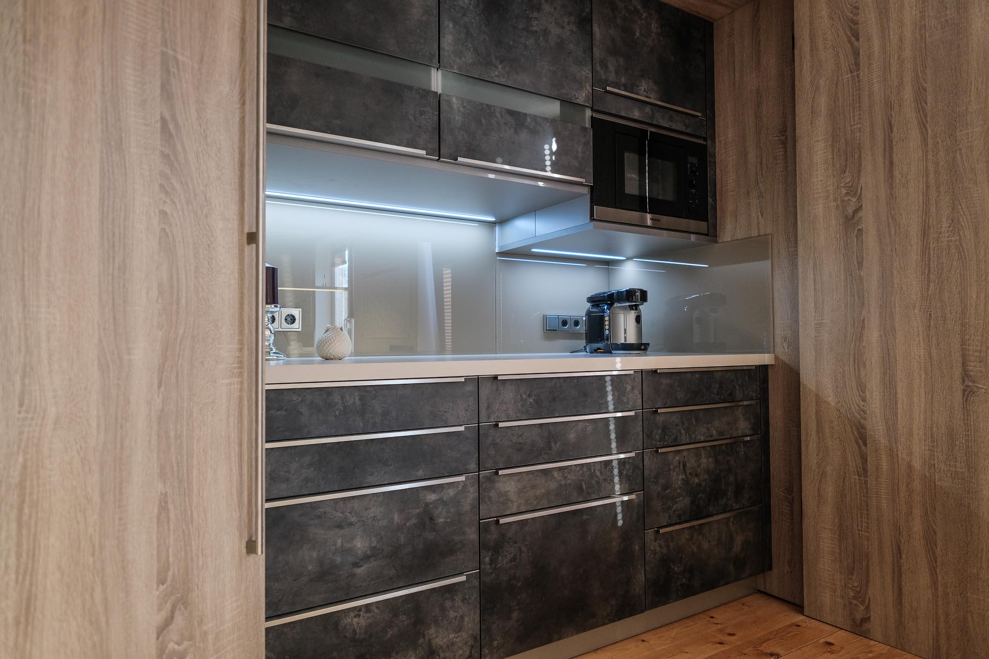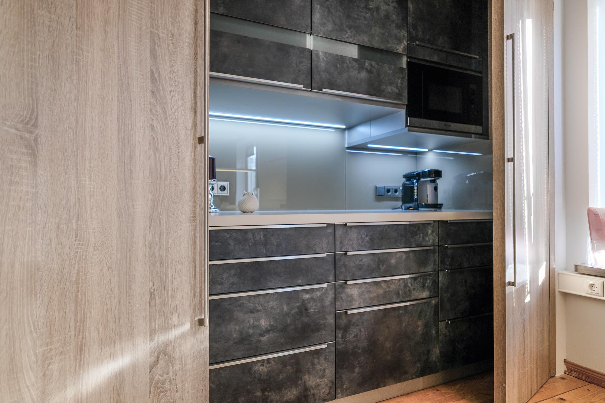 Wer sagt eigentlich das eine Kaffeeküche im Büro nicht auch etwas Besonderes sein darf. Unsere hochwertige Businessküche in dunkler Betonoptik mit matt geschliffenen Edelstahlgriffen und Echtglasrückwand wäre der Beweis dafür.